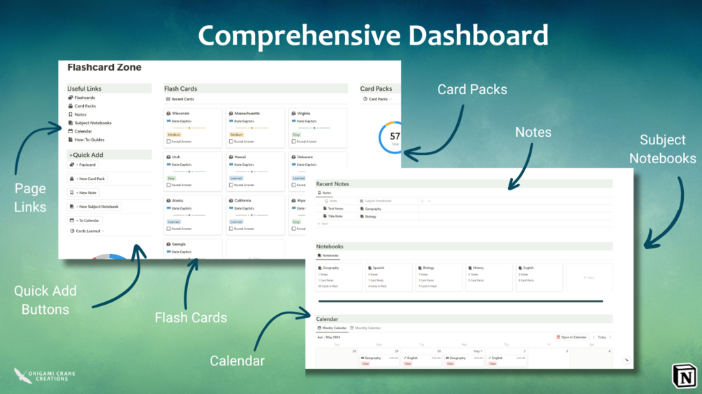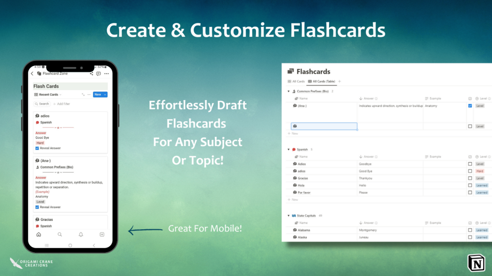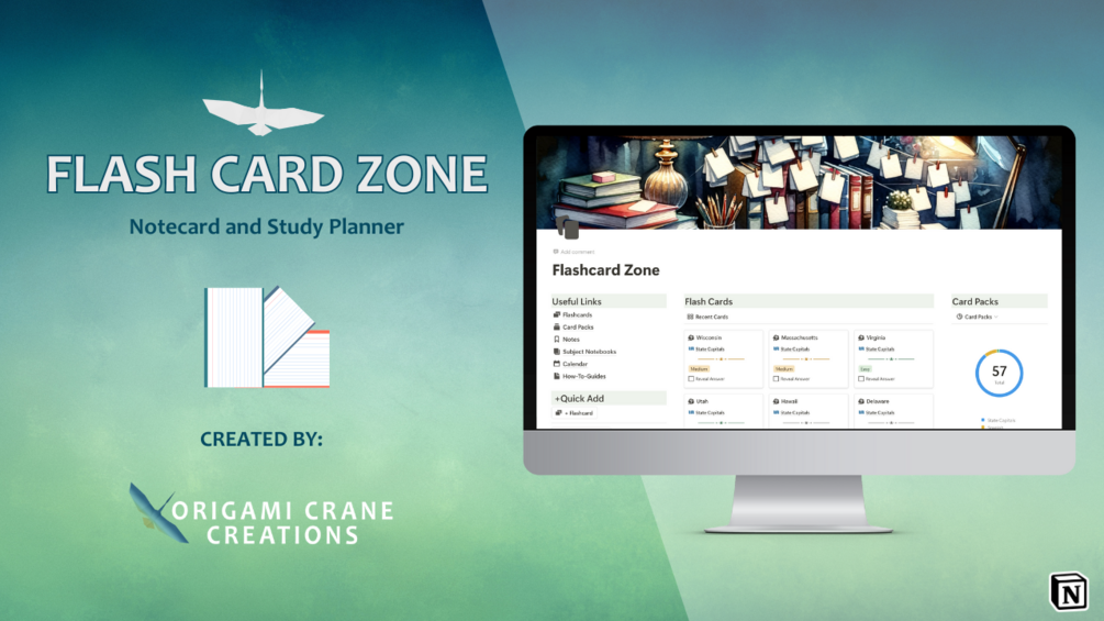 The newest solution from Origami Crane Creations! Flashcard Zone is a meticulously designed template that revolutionizes the way you study, organize, and achieve academic success. Tailored to the needs of dedicated learners, this powerful tool harnesses the simplicity and versatility of Notion to bring your study sessions to a new level of efficiency and effectiveness.