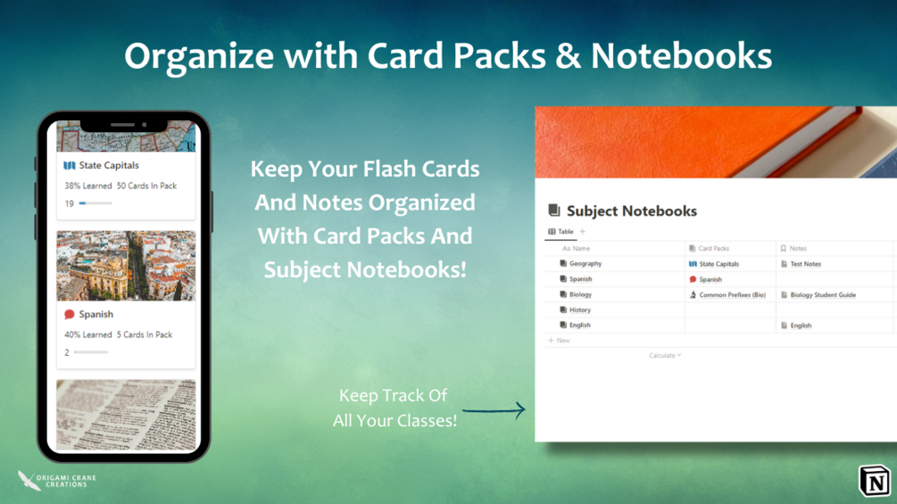 - Subject-Specific Notebooks: Categorize cards, packs, and notes by classes or subjects for easy retrieval.