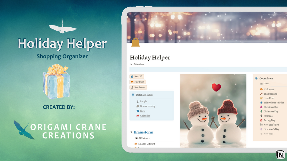 Origami Crane CreationsHoliday Helper, run by Notion, helps organize your holiday shopping information (Gifts, People, Costs, Events, etc).