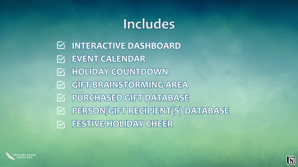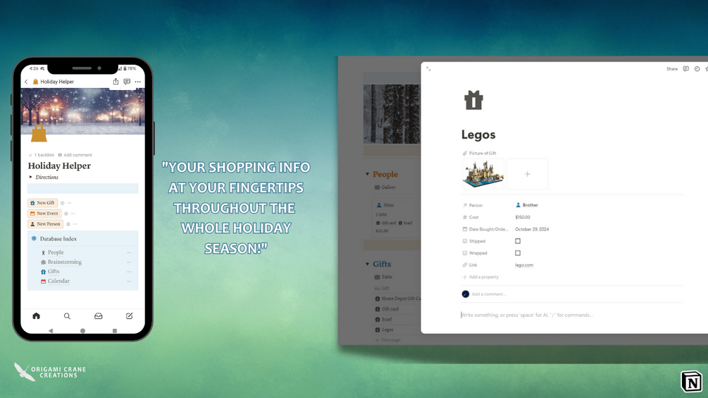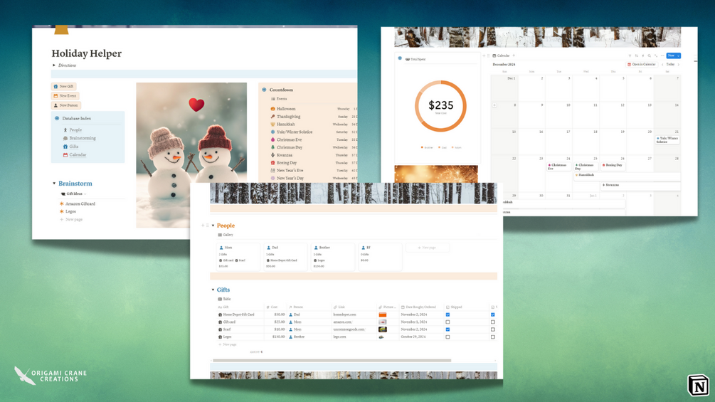 Origami Crane CreationsHoliday Helper, run by Notion, helps organize your holiday shopping information (Gifts, People, Costs, Events, etc).