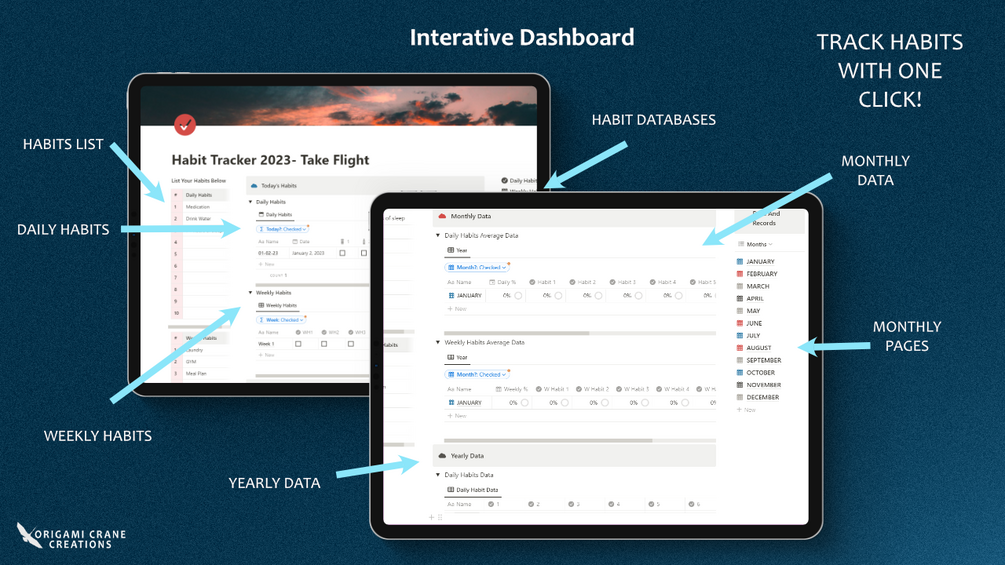 Don’t miss out on the Habit Tracker 2023. It’s the perfect solution for tracking your habits throughout the entire year. Take flight and see how far you soar.