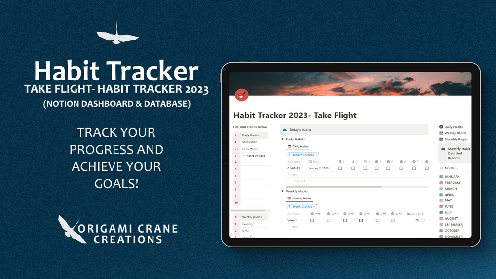 The Take Flight: Habit Tracker 2023 (Notion) is the perfect way to stay organized and motivated in achieving your goals. It can become difficult to keep track of and monitor any habit(s) you would like to develop.